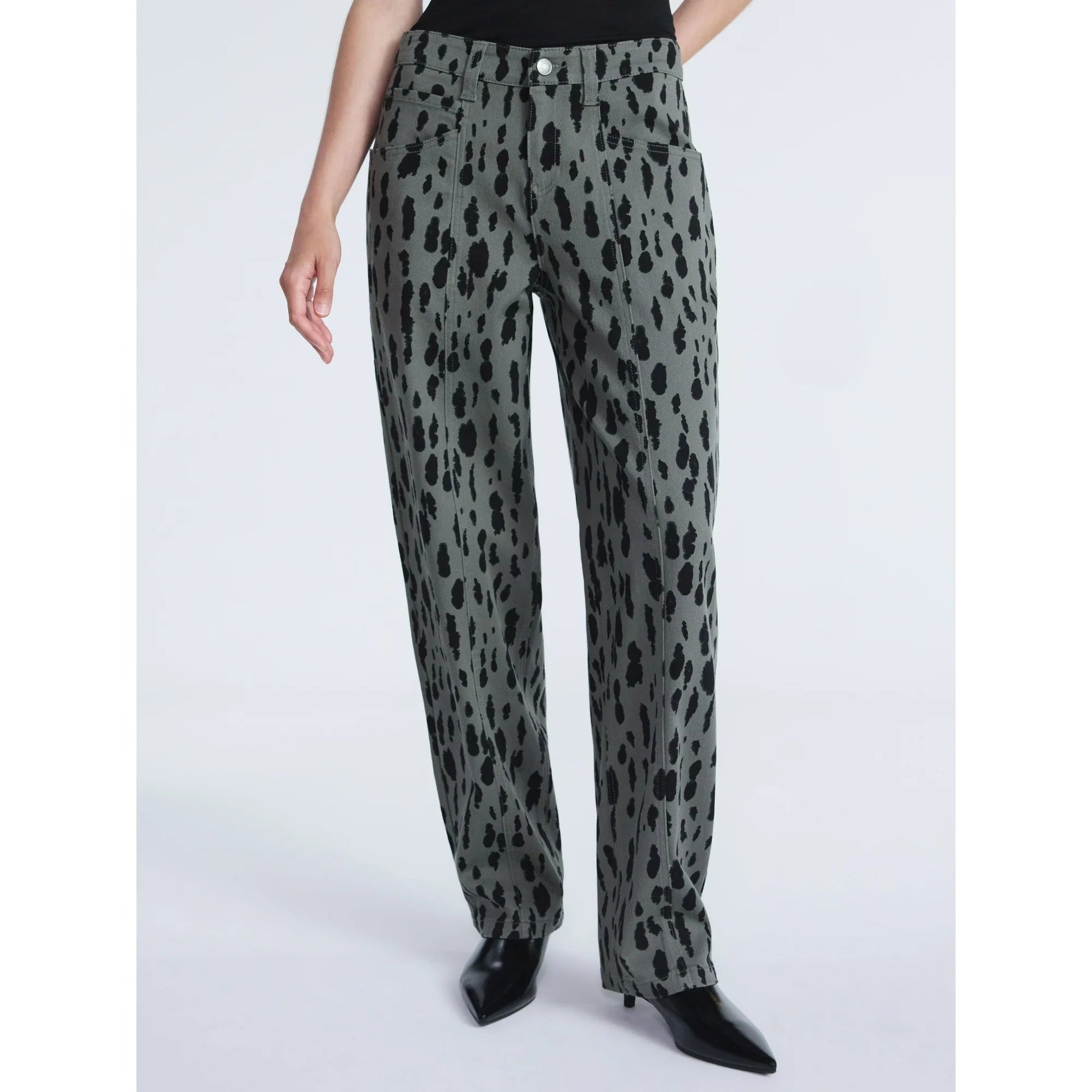 Features: Utility-inspired seam details at front legs; allover animal print
