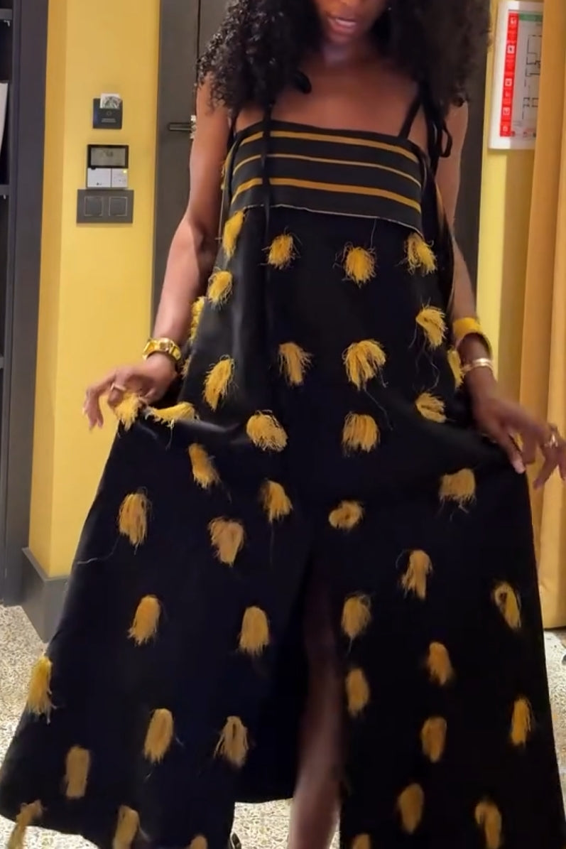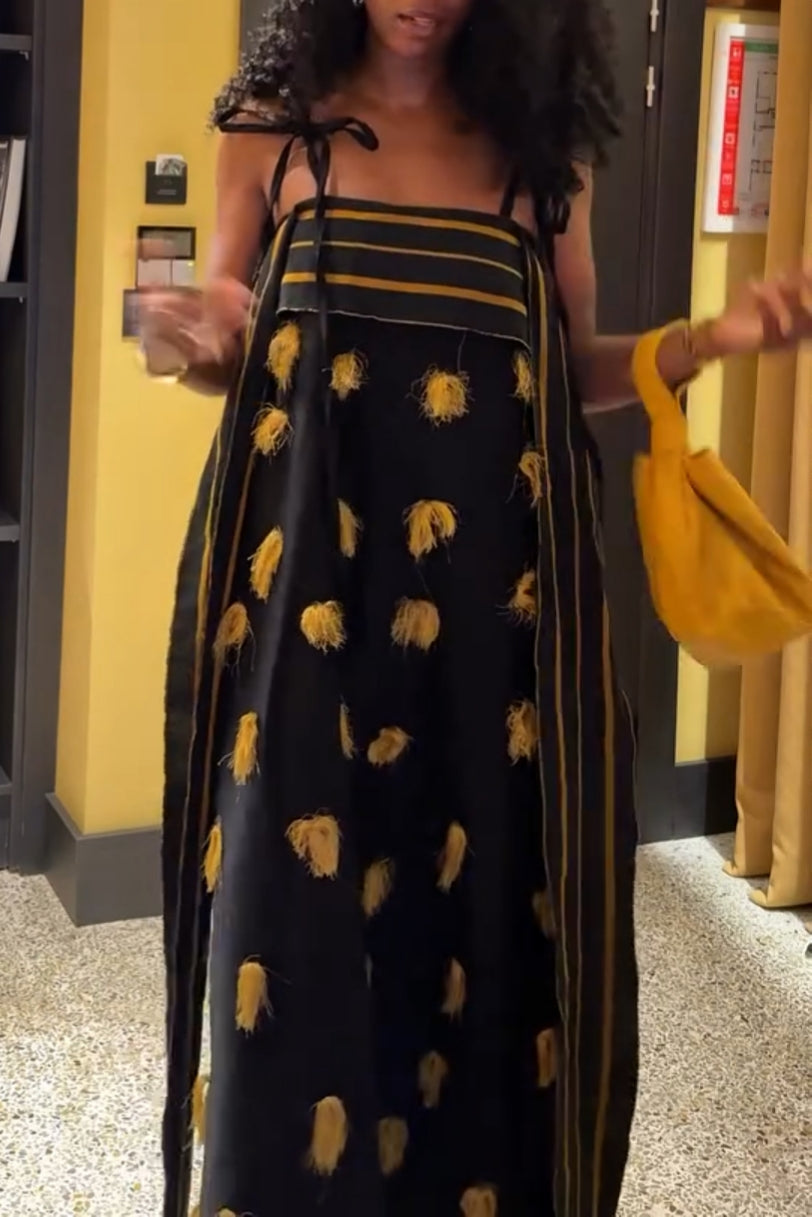 Black Spaghetti Strap Tassel Embroidered Asymmetrical Midi Dress