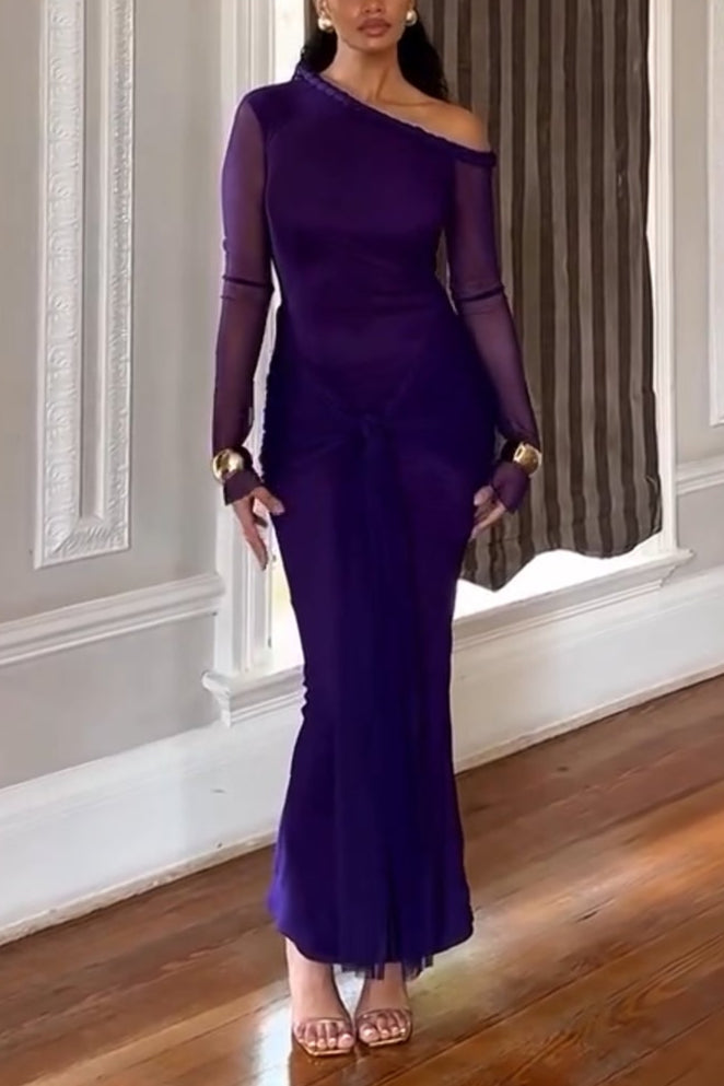 Elegant One-Shoulder Mesh Sleeve Maxi Dress
