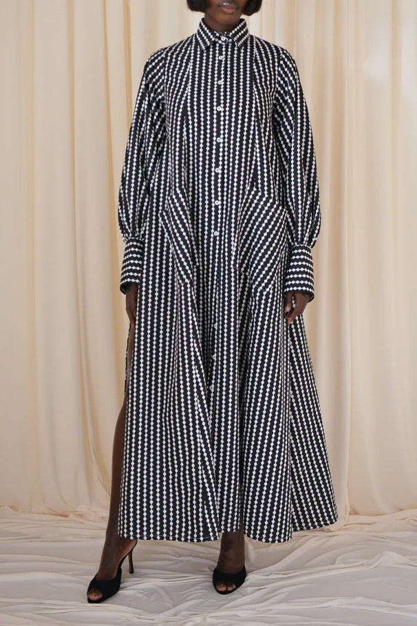 Maxi Flared Shirt Dress in Black & White Diamond Stripes