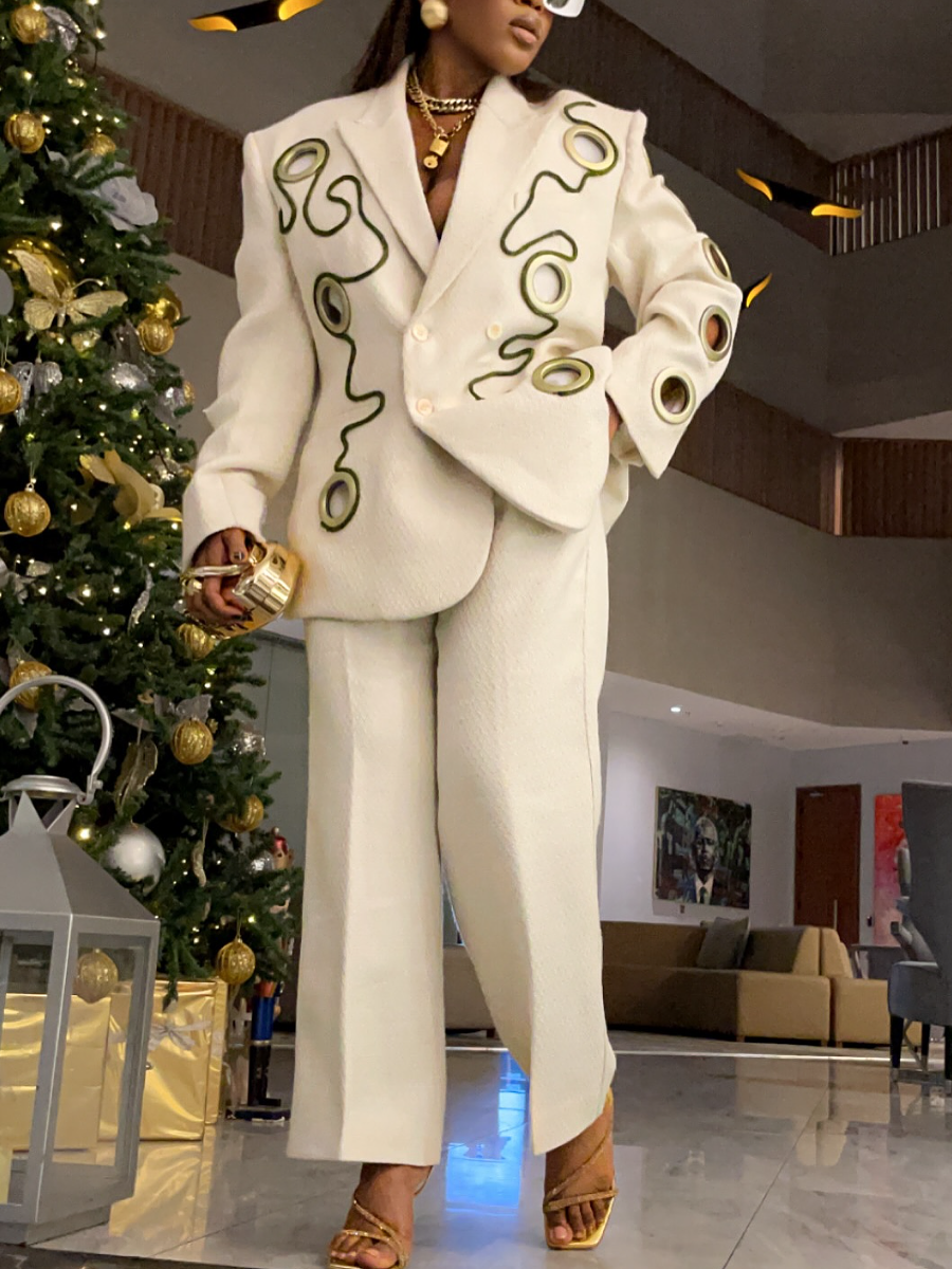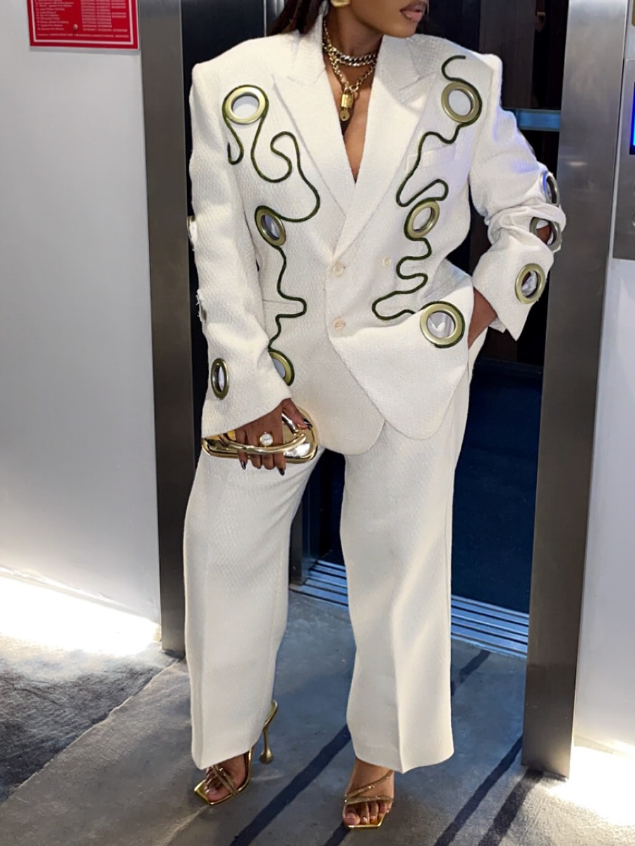 Metal Ring Decorated With Black Lines And White Suit Jacket
