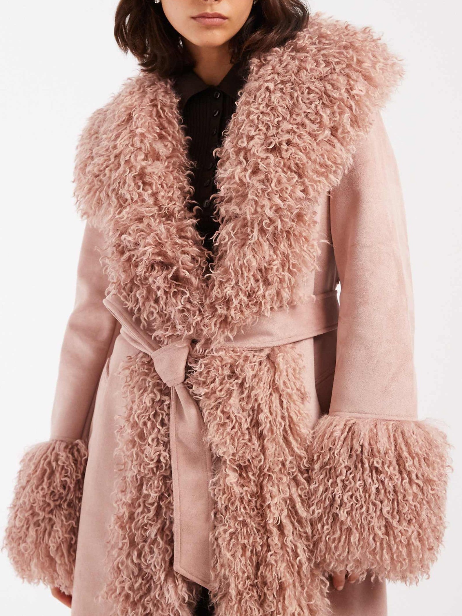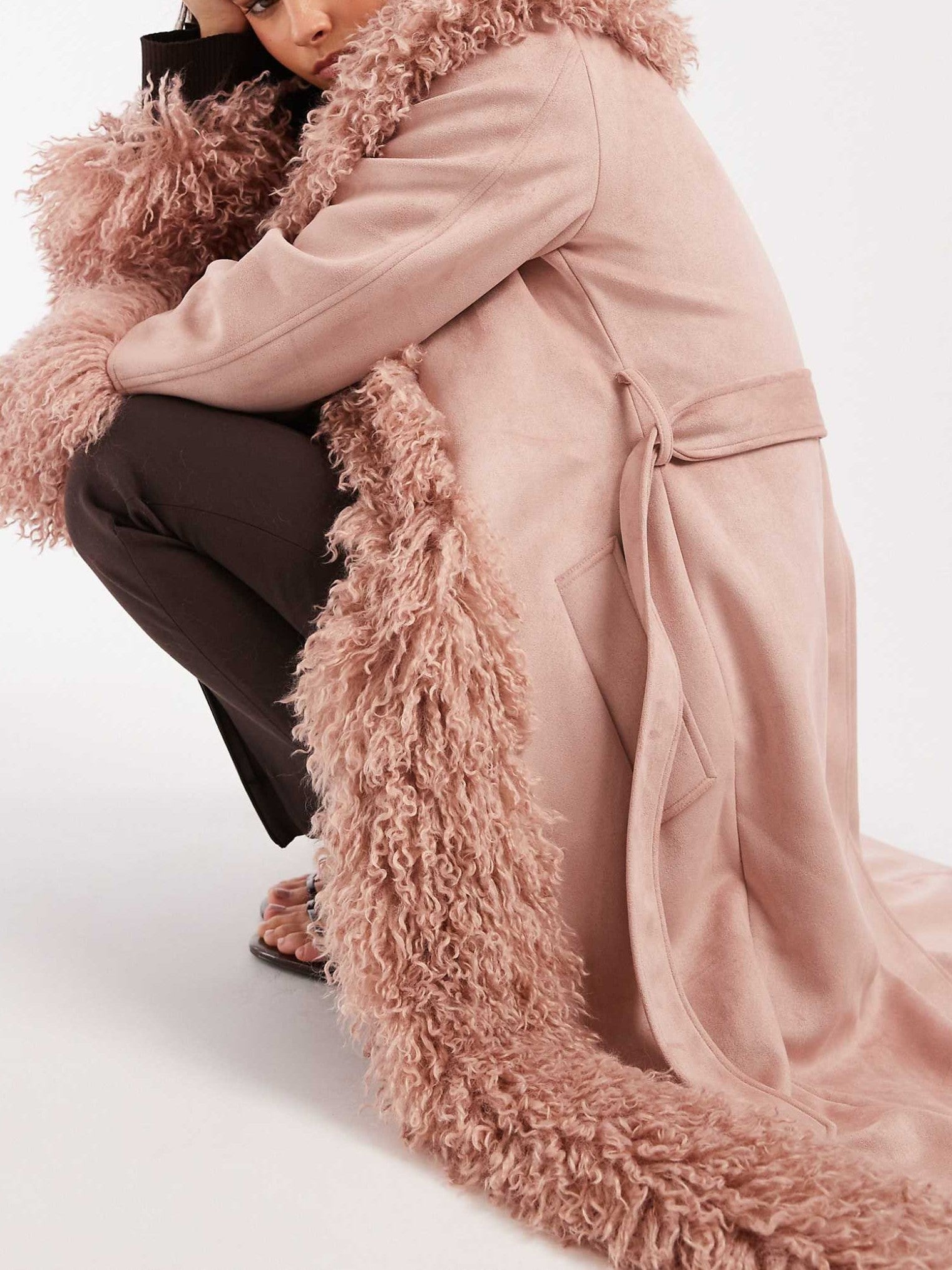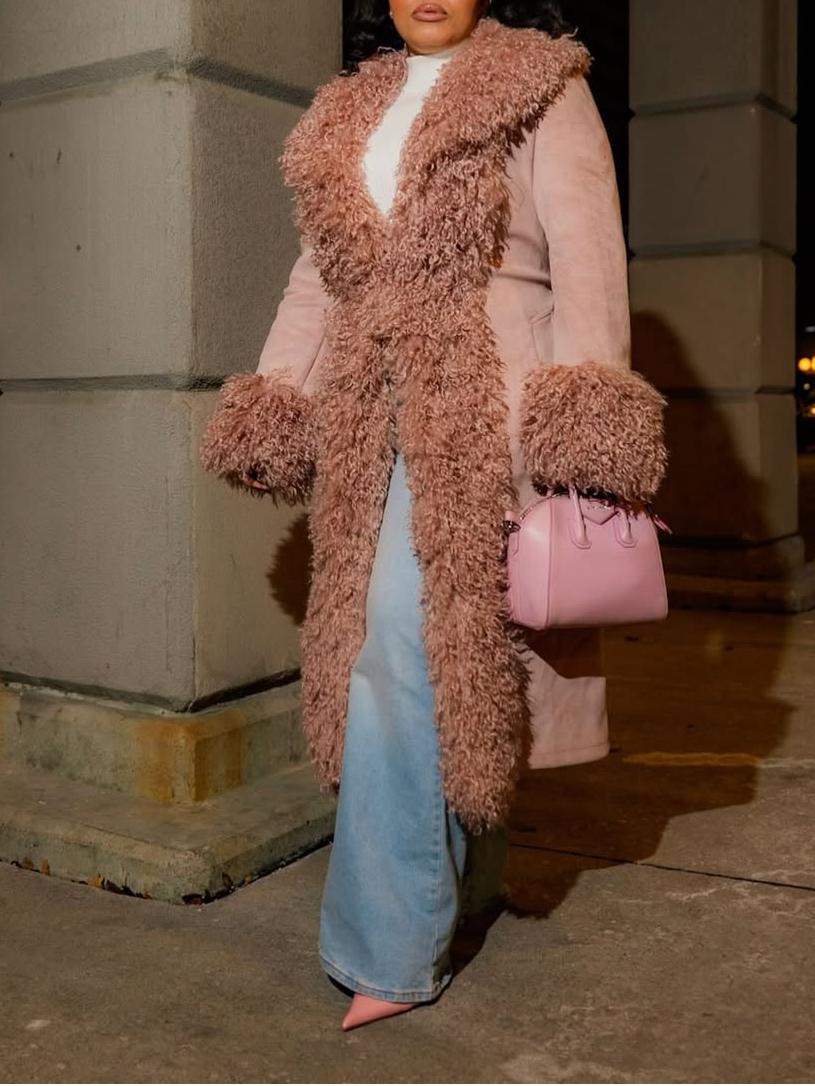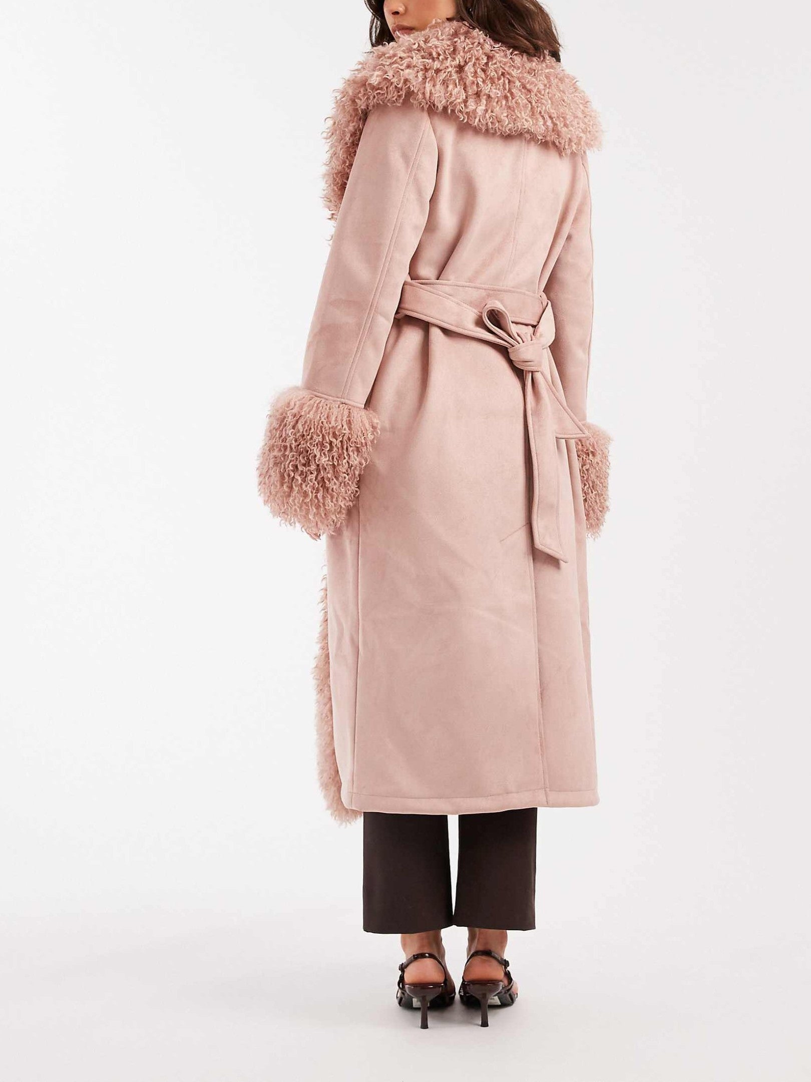 Suedette Faux Mongolian Trim Trench Coat