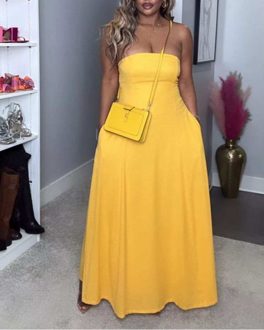 Strapless neckline with hidden elastic. Maxi length with a fit and flare silhouette and pockets at side