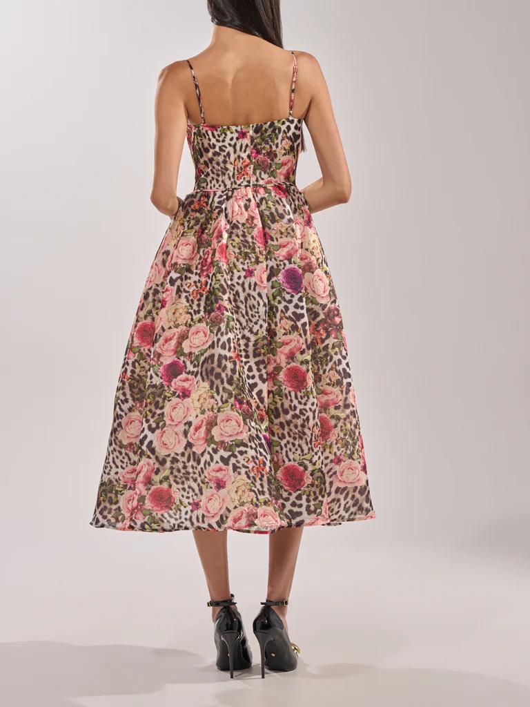 This fierce printed maxi dress is crafted from a sleek, lightweight fabric with a bold leopard-and-rose graphic pattern, a structured corset-inspired bodice, and a sweeping full-length skirt that moves like a dream. Featuring a sweetheart neckline, padded bust cups, adjustable tank straps, a back zip closure, and seamed detailing that snatches the waist for a flattering, feminine shape. Complete with a sleek inner lining and tulle in the skirt for added volume. Style it with strappy heels, a sleek clutch, and gold statement earrings for weddings, date nights, and every RSVP in between.